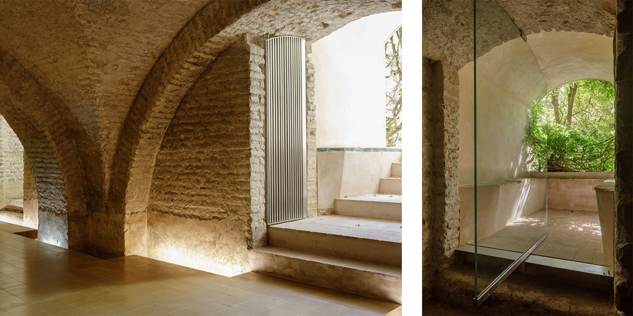 Dentro de la restauración de los sótanos del palacio mudéjar del Real Alcázar de Sevilla se realiza la carpintería y cerrajería, puertas y ventanas pivotantes fabricadas en acero inoxidable con perfiles mínimos y celosía de dos hojas pivotante de lamas fijas tupidas en lamas de chapa de 1,5 mm de espesor formando Z, permite la relación de las naves con los jardines.