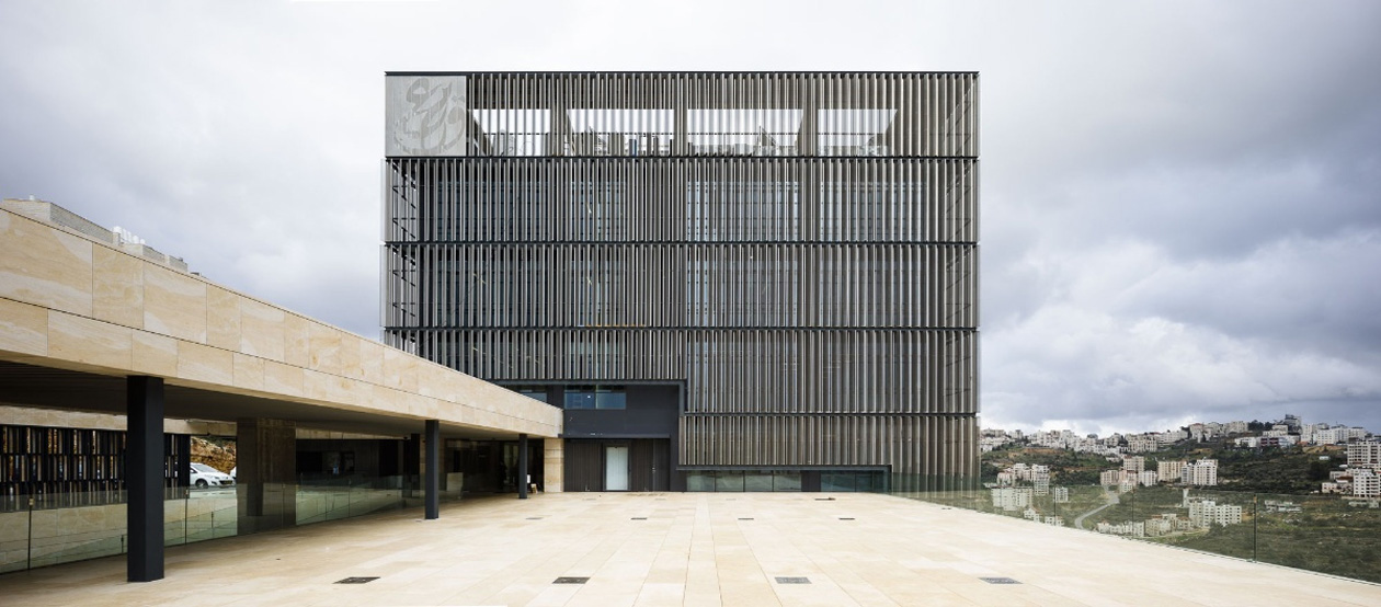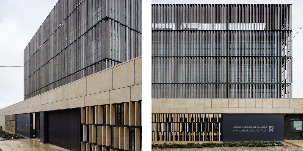 Fabricación de lamas de aluminio perforadas y plegadas para envolvente de fachada de más de 2.100 m2 en la sede de la Qattan Foundation en Ramalah, Palestina. En su interior alberga un gran mural metálico de 12 metros de altura, realizado en chapa de aluminio perforada inspirado en los bordados tradicionales palestinos.