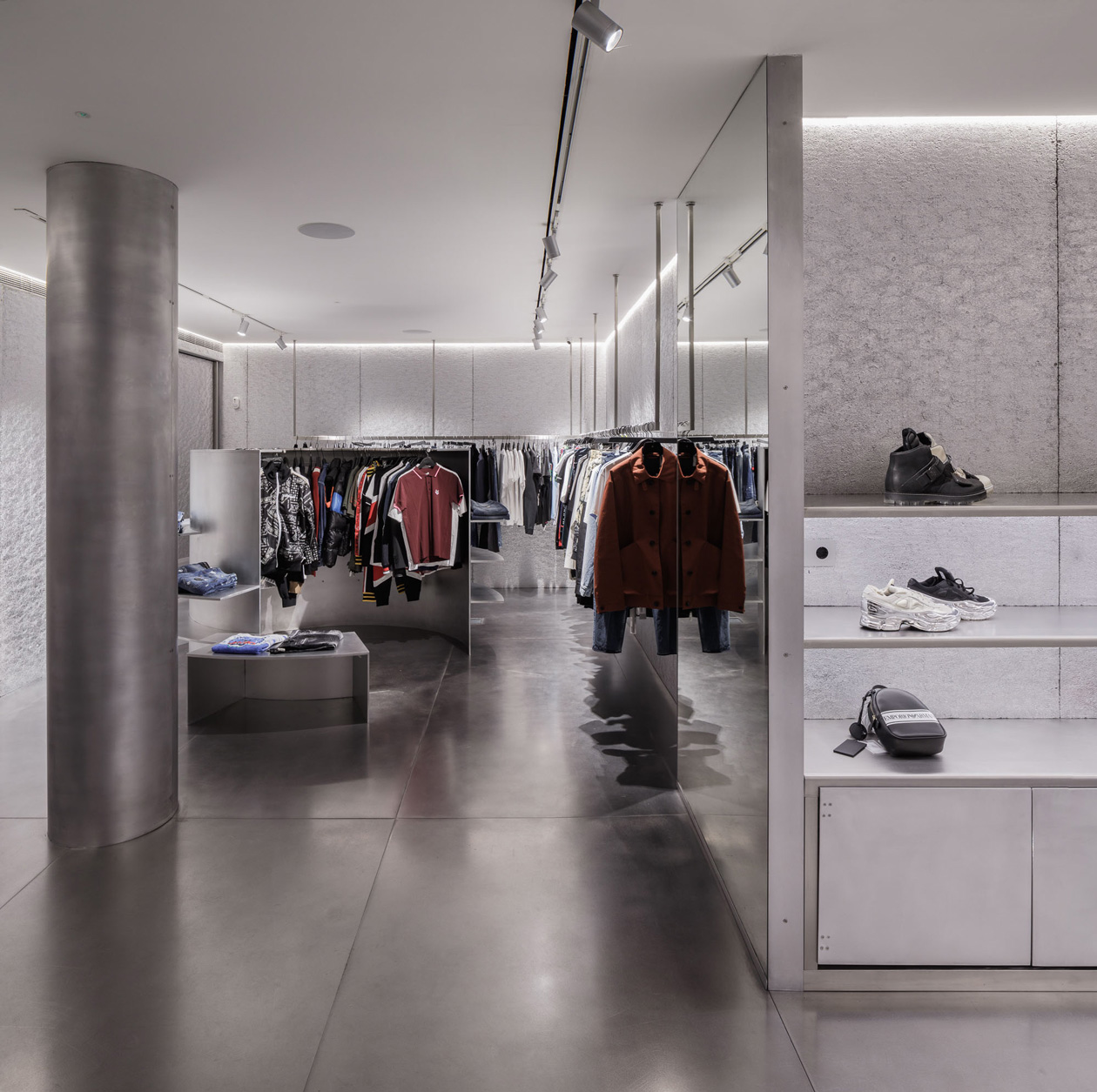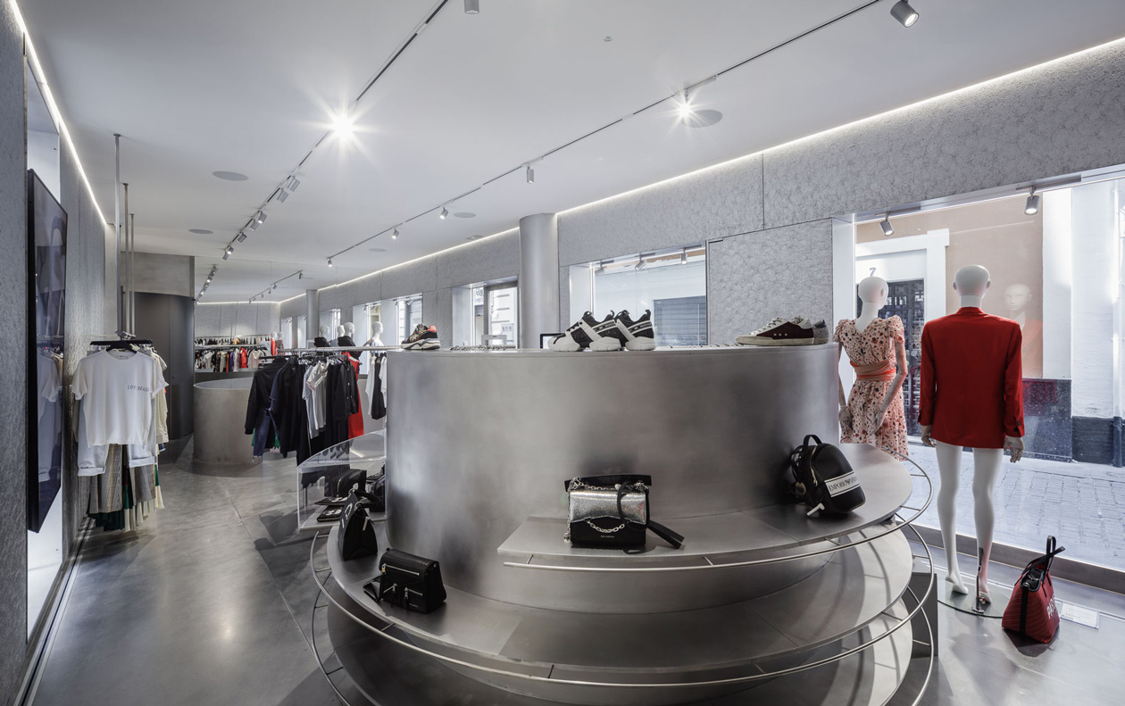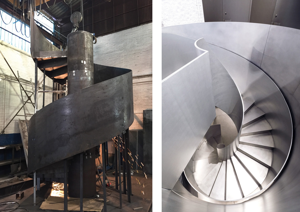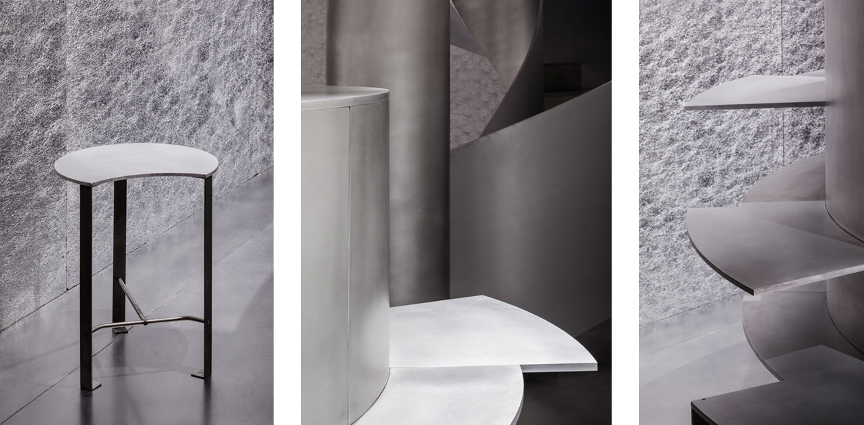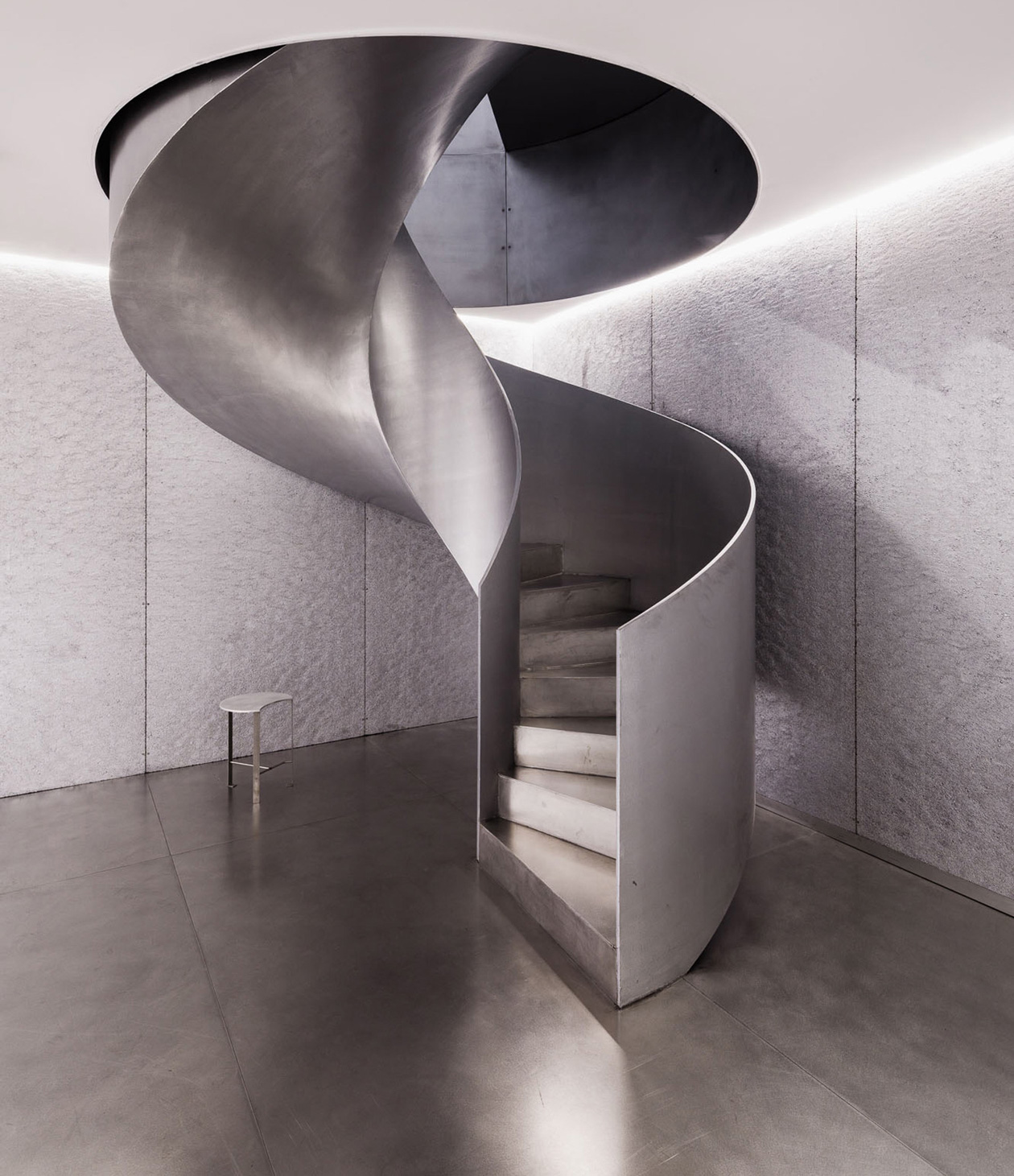 El nuevo espacio para la tienda Markaride se articula a partir de una escalera helicoidal en chapa de AlMg justo en el lugar en que las plantas baja y sótano se superponen. Esta hélice, a modo de perno gigante, se constituye en el eje de giro que permite la articulación de las dos plantas, baja y sótano, revestidas con panel de espuma de aluminio. La localización y trazado de la escalera va a determinar