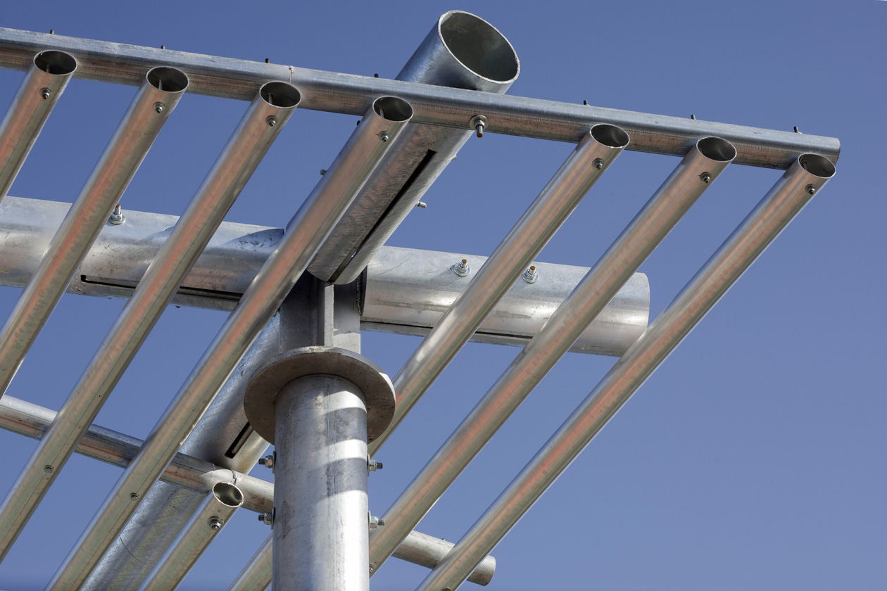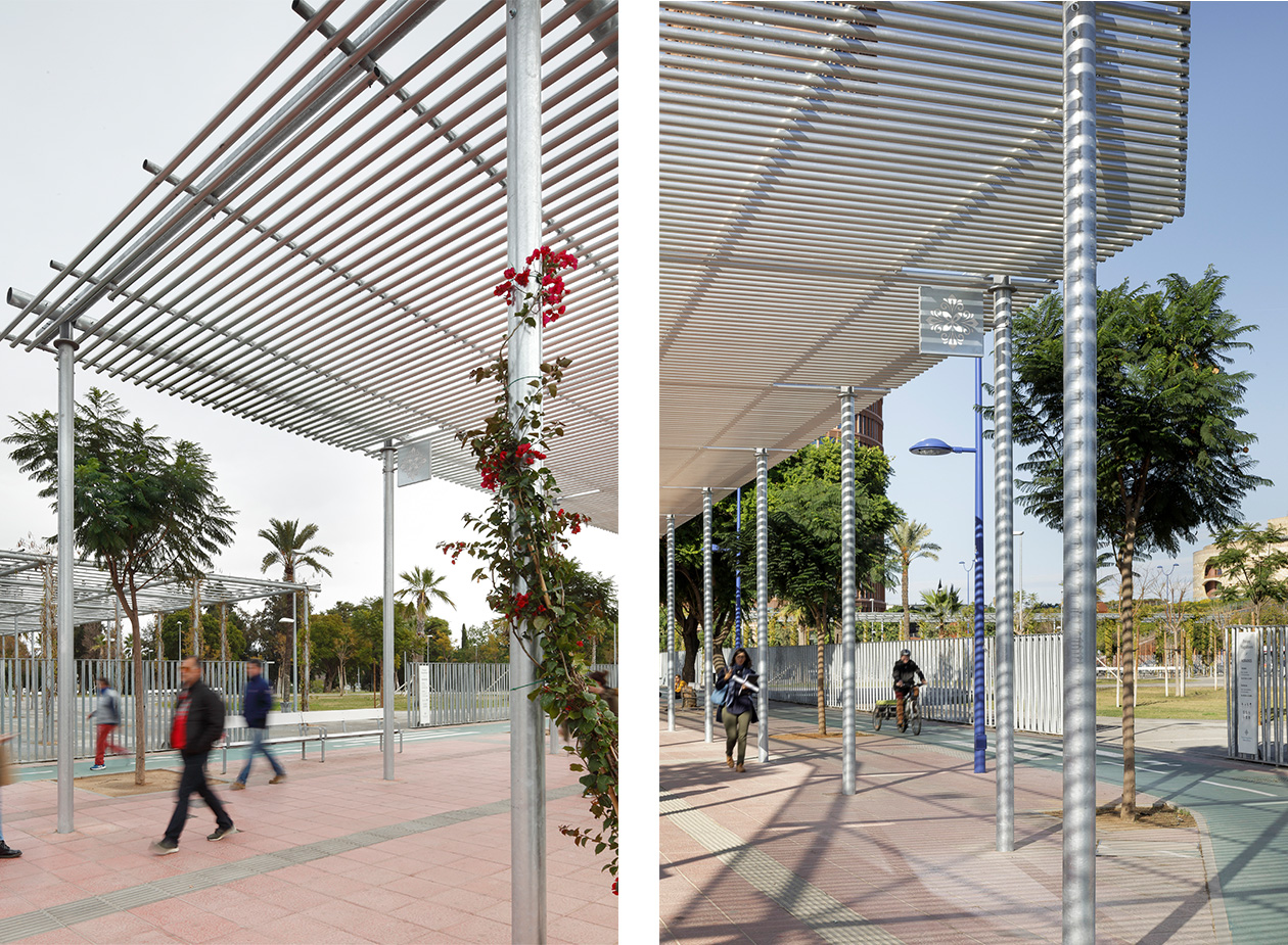 Fabricación y montaje de pérgola en tubos de acero galvanizado de Ø152,5x5 y de aluminio de Ø60x2, con uniones atornilladas.