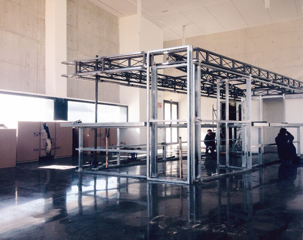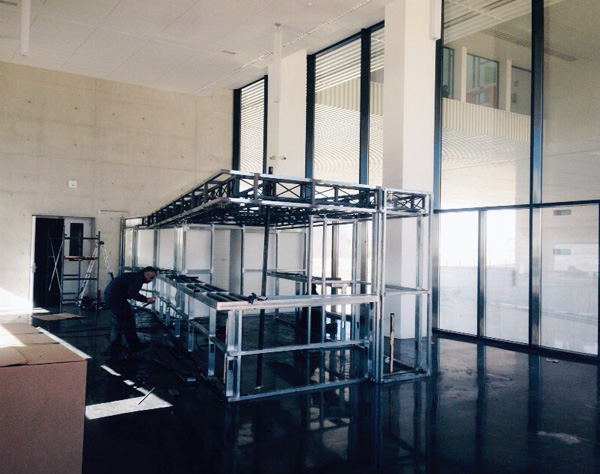 Estructura tubular para formación de barra de bar, cubierta y divisiones interiores en la cafetería del Campus Universitario de Linares.