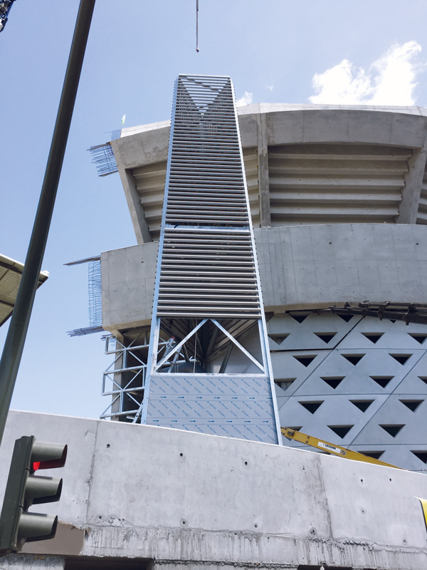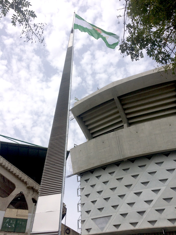 Torre para bandera y salida de instalaciones en el Gol Sur del estadio del Real Betis, fabricada con perfiles PNL de 100, 90, 80, 60 galvanizados en caliente y forrado con lamas de acero inoxidable.