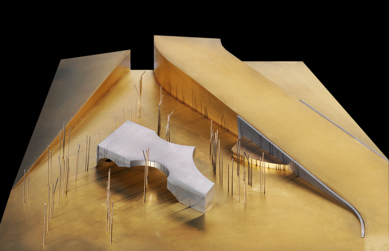 Maqueta de la plaza y marquesina que da acceso al Caixa Forum de Sevilla, fabricada en chapa de latón y aluminio.
