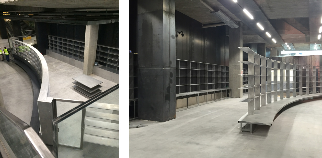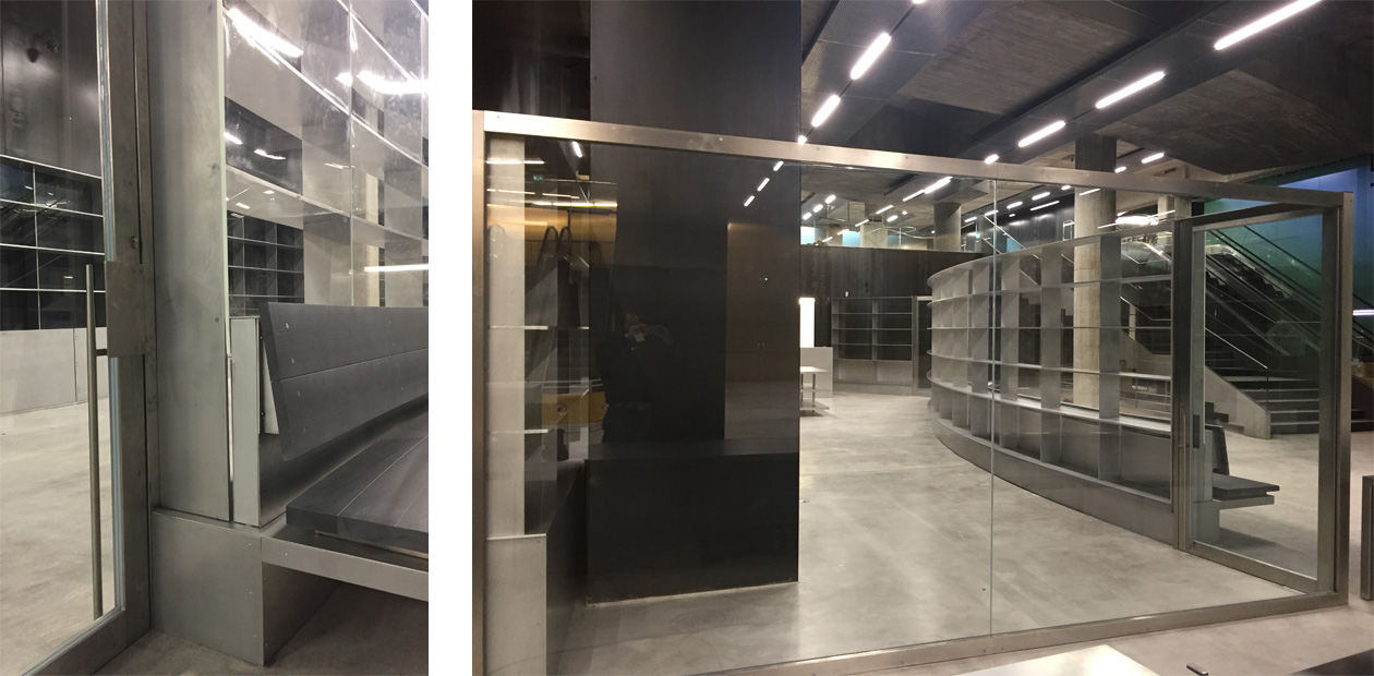 Mobiliario fabricado en aluminio para mostrador de atención al público, mostrador de tienda, estanterías, estanterías de tienda y expositores. Bancos de aluminio para salas expositivas.