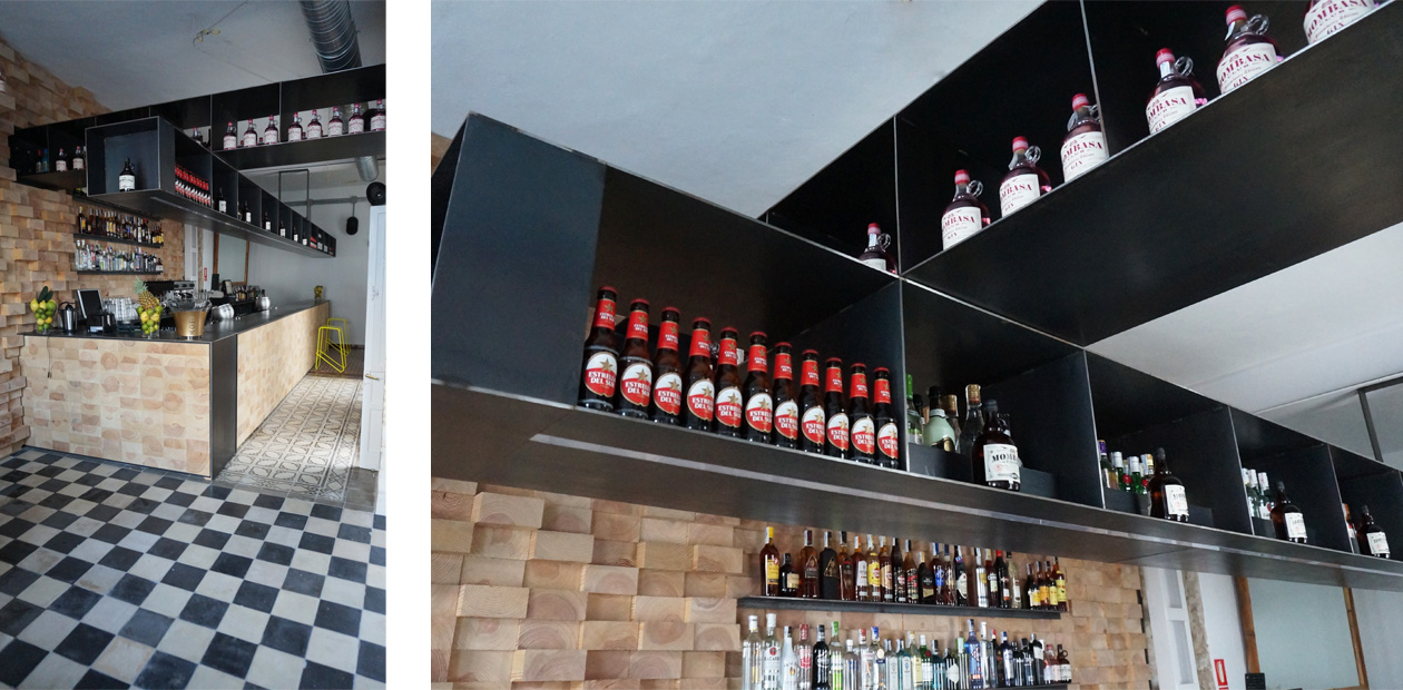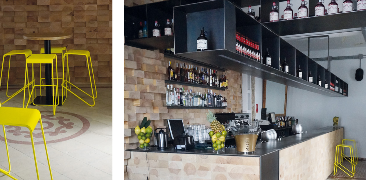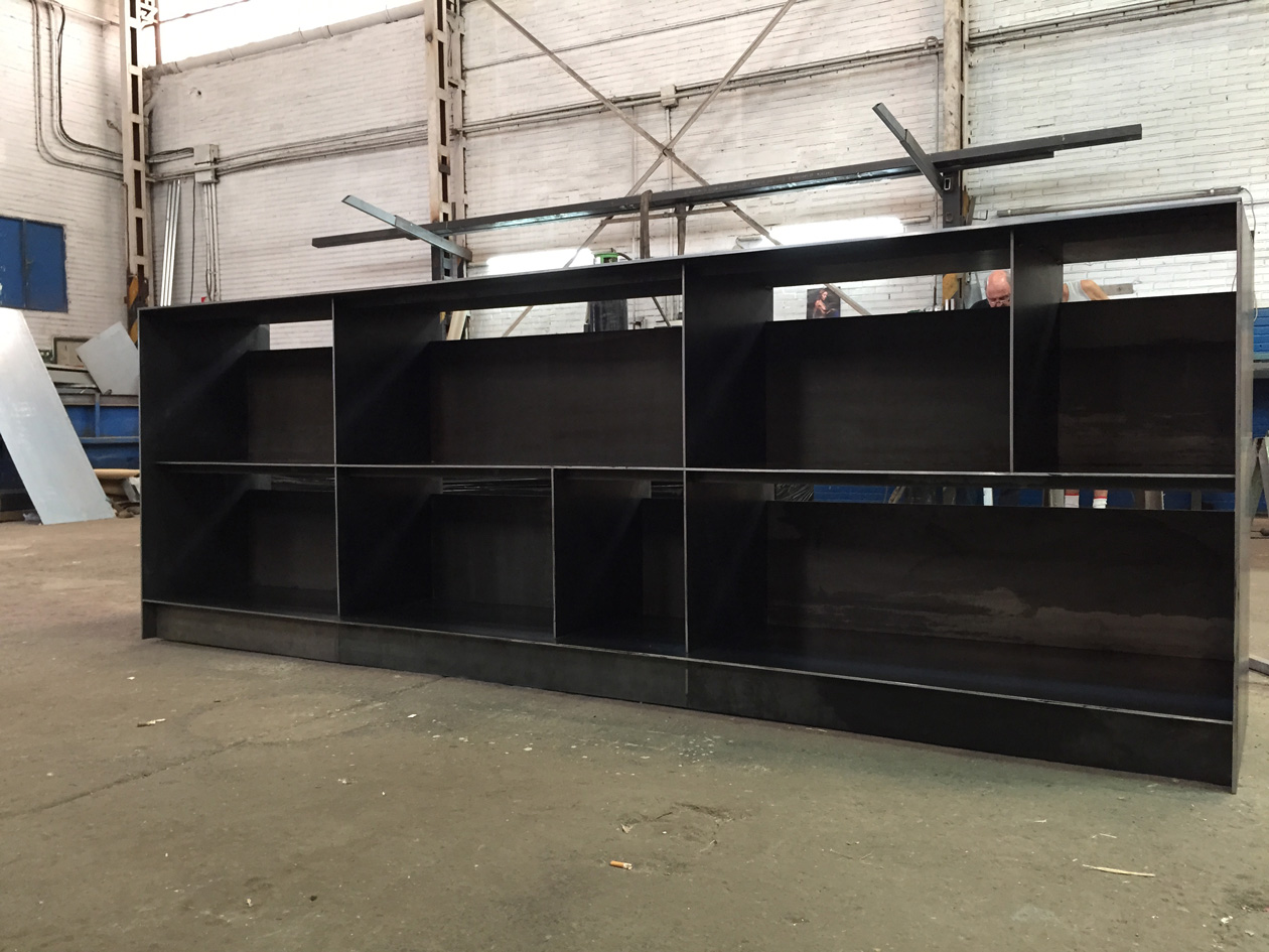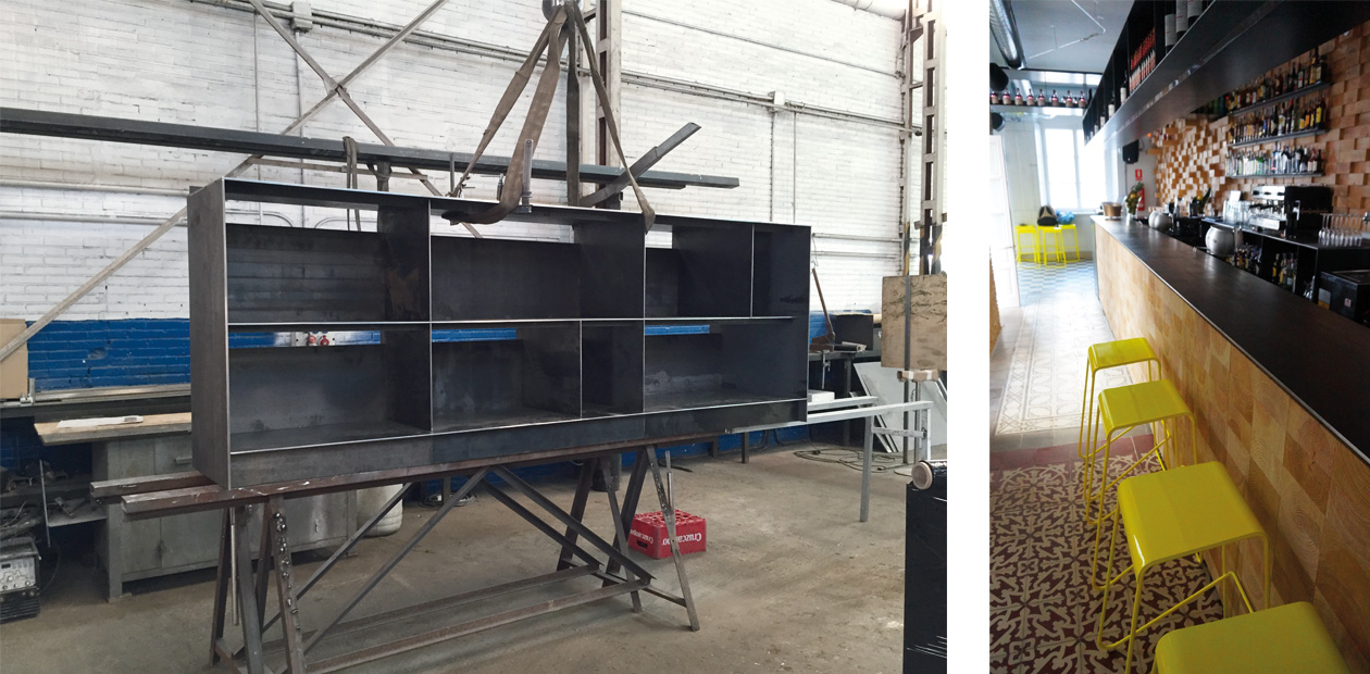 Fabricación y montaje de estructura de barra de bar, botelleros y muebles traseros en chapa de acero negra. Bancos lacados según diseño.