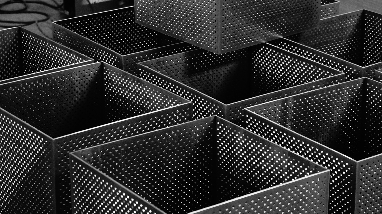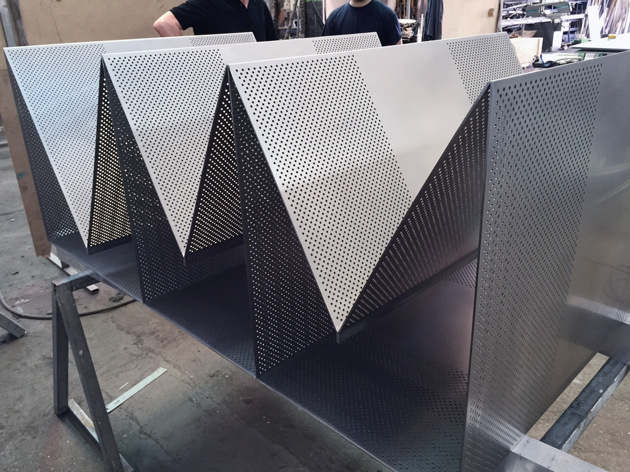 Suministro de mobiliario para museo, fabricado en chapa de acero inoxidable con patrón de perforaciones según diseño.