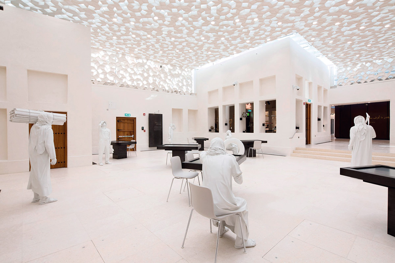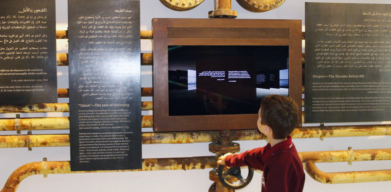 Fabricación en taller e instalación in situ (Qatar) de mobiliario museístico, soportes de interactivos, paneles grabados, etc. Todo fabricado en chapa de acero con diferentes acabados.