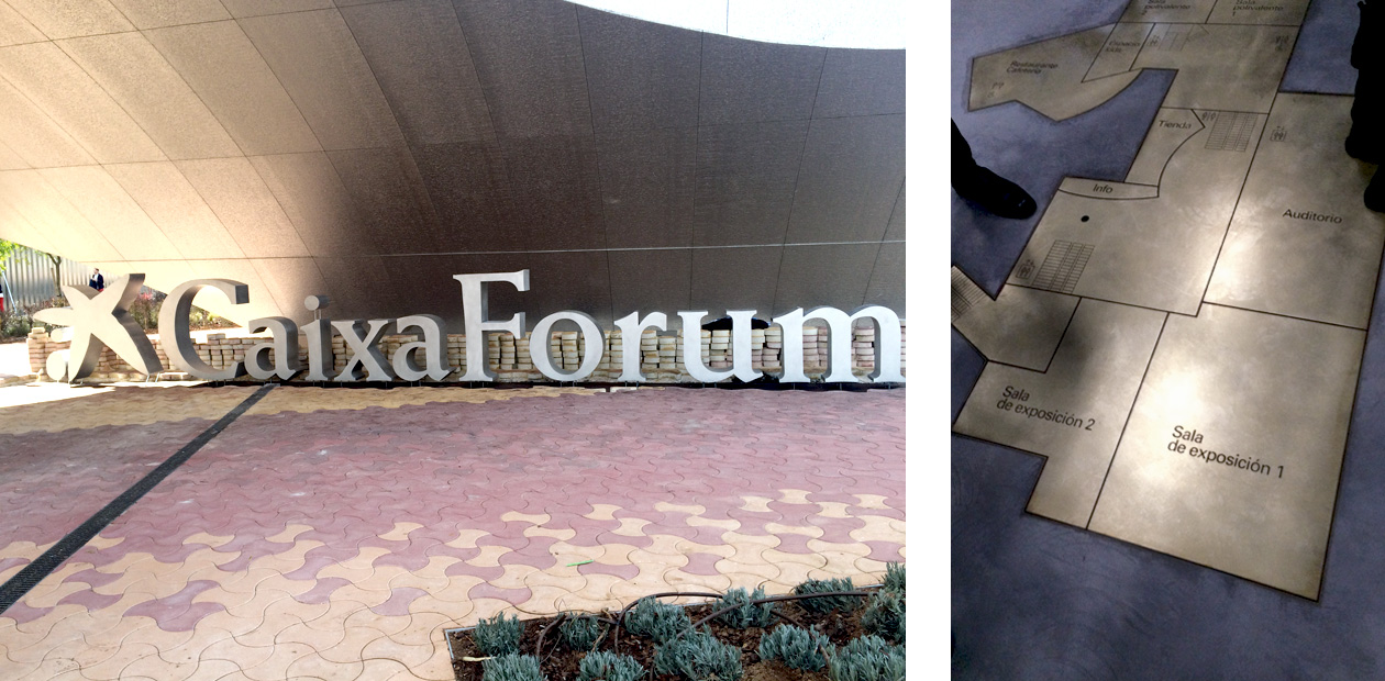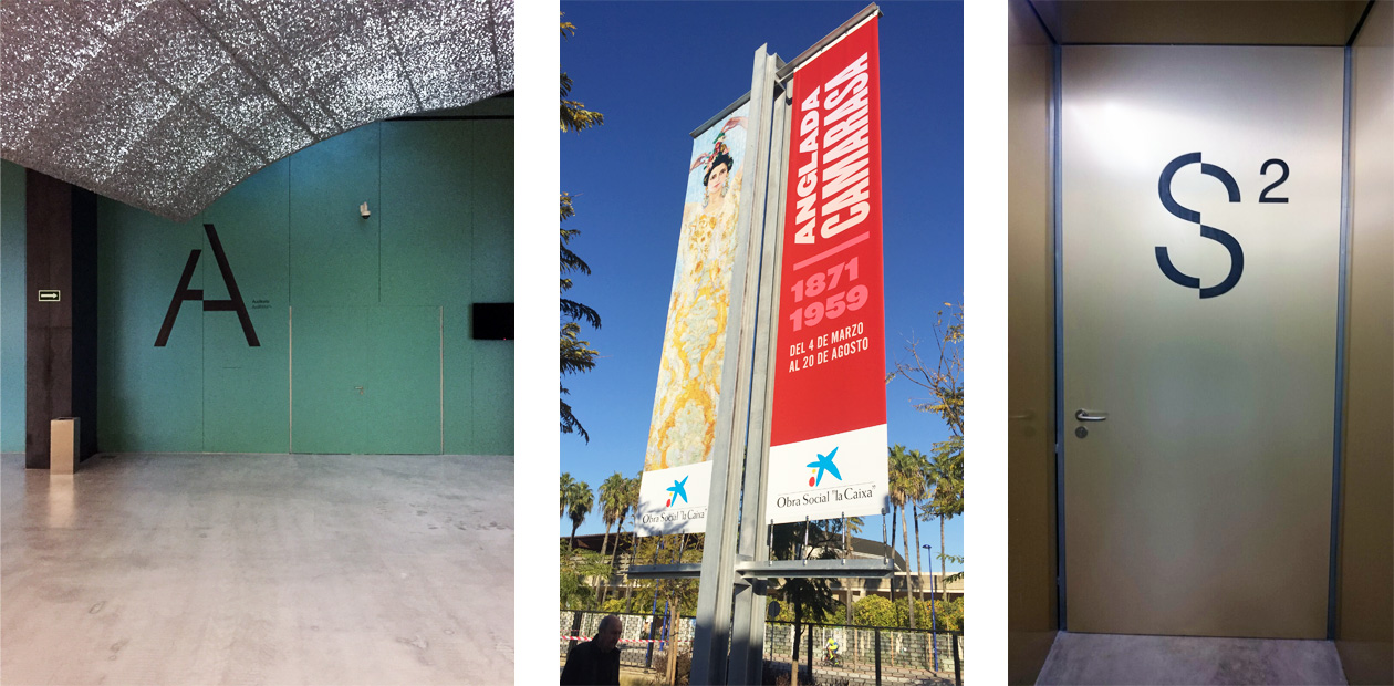 Fabricación e instalación de señalética interior y exterior y rotulación corporativa del Caixa Forum Sevilla, empleando chapa de acero negro, latón y aluminio.