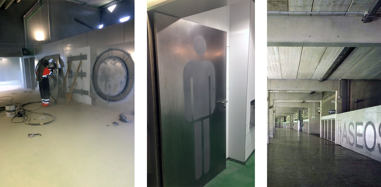 Chorreado con arena de letreros y pictogramas sobre chapas de acero inoxidable.