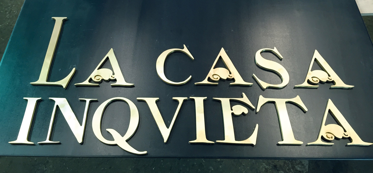 Rótulo en chapa de acero negro y letras en latón para "La Casa Inquieta", Conil.