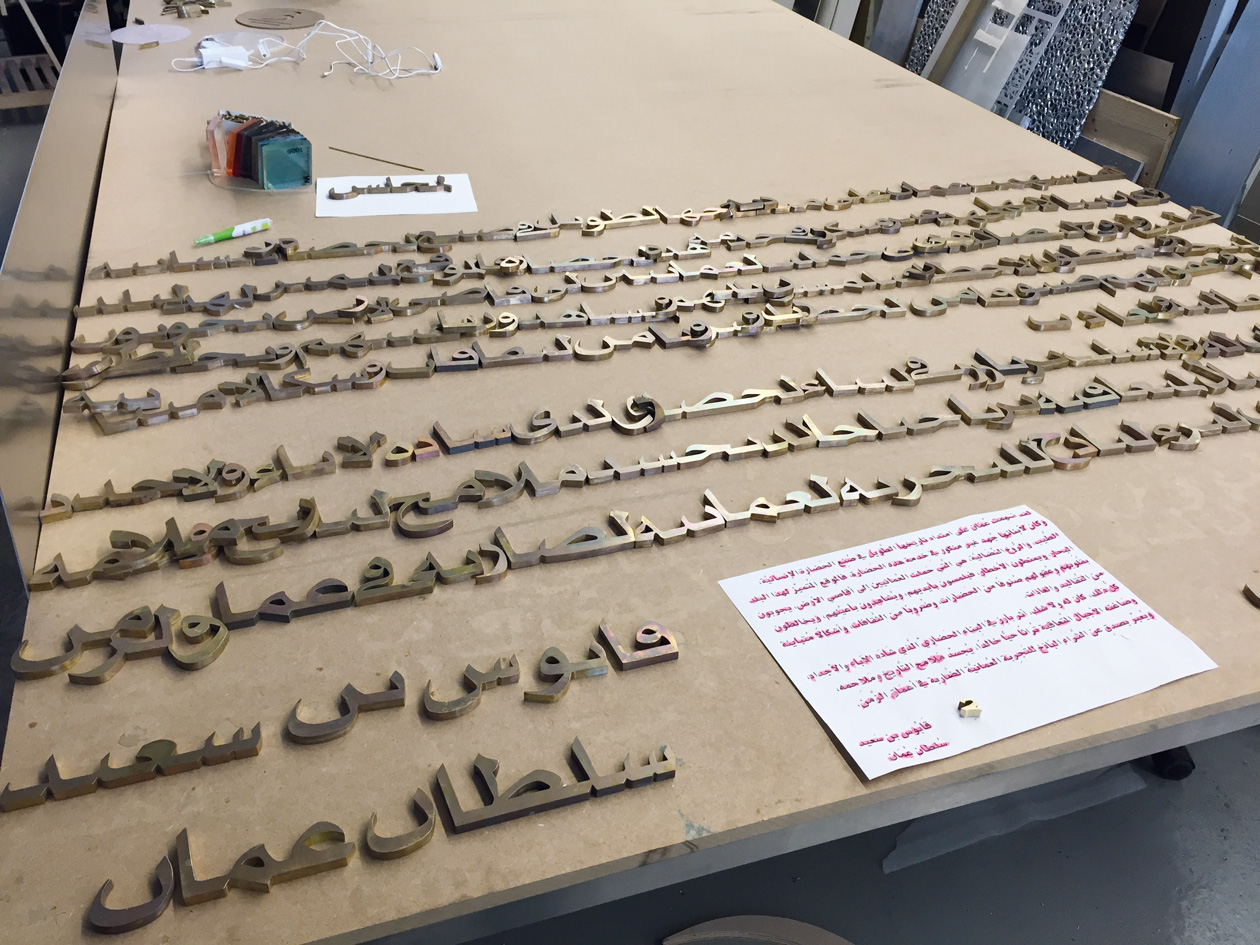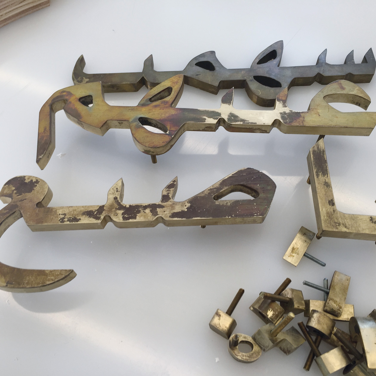 Fabricación de textos en latón de 8 y 10 mm con tipografía de diferentes alfabetos y con tratamiento de bronzado.